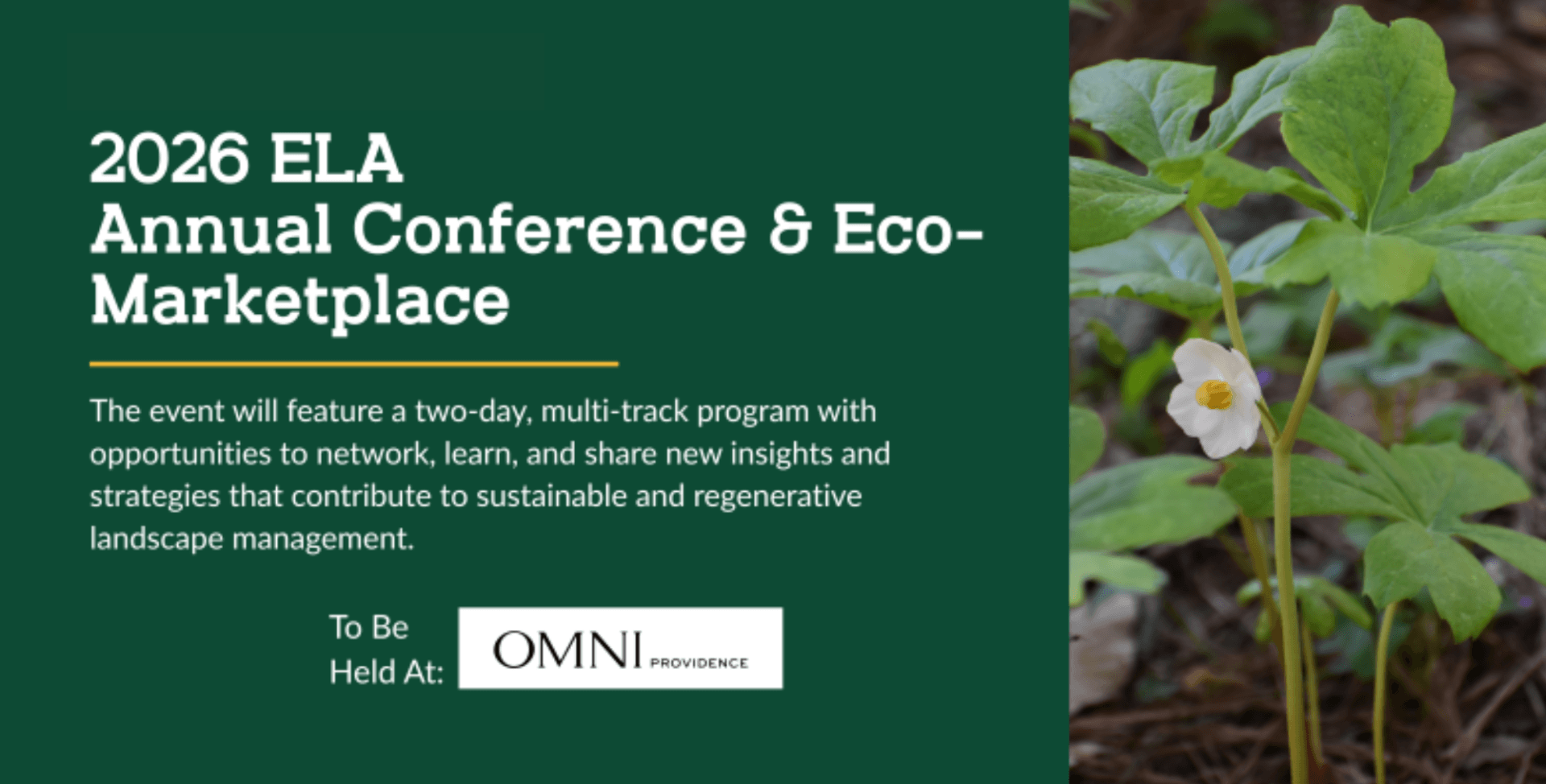The Ecological Landscape Alliance (ELA) is excited to announce the 2026 Annual Conference & Eco-Marketplace to be held on August 27 and 28, 2026, in Providence, Rhode Island. The Annual Conference brings together leaders in ecological landscape practices with a diverse range of professionals involved in landcare, including landscape architects, designers, growers, horticulturists, land stewards, arborists, and installation/maintenance technicians. We also welcome students, educators, native plant enthusiasts, community activists, and home gardeners. The event will feature a two-day, multi-track program with opportunities to network, learn, and share new insights and strategies that contribute to sustainable and regenerative landscape management.